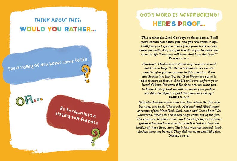 With every turn of the page, kids will be encouraged to dig deeper into their Bibles, as they learn that God's Word is never boring, and it always applies to their everyday lives!