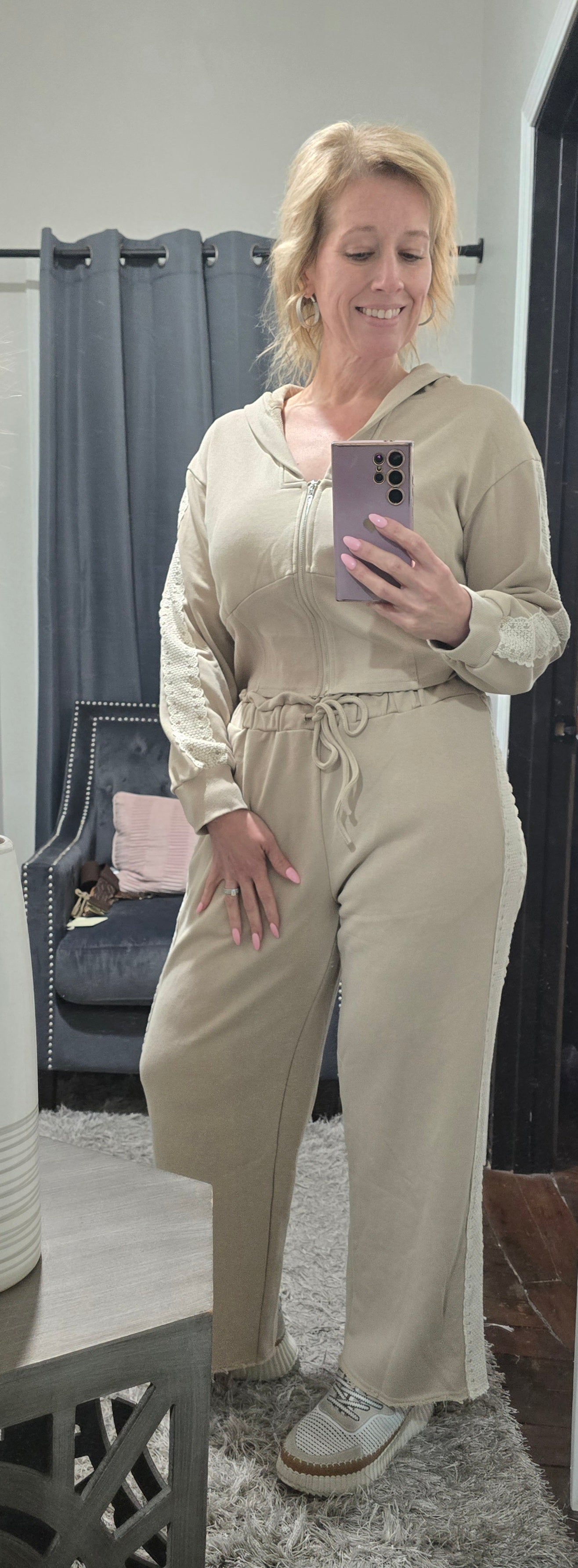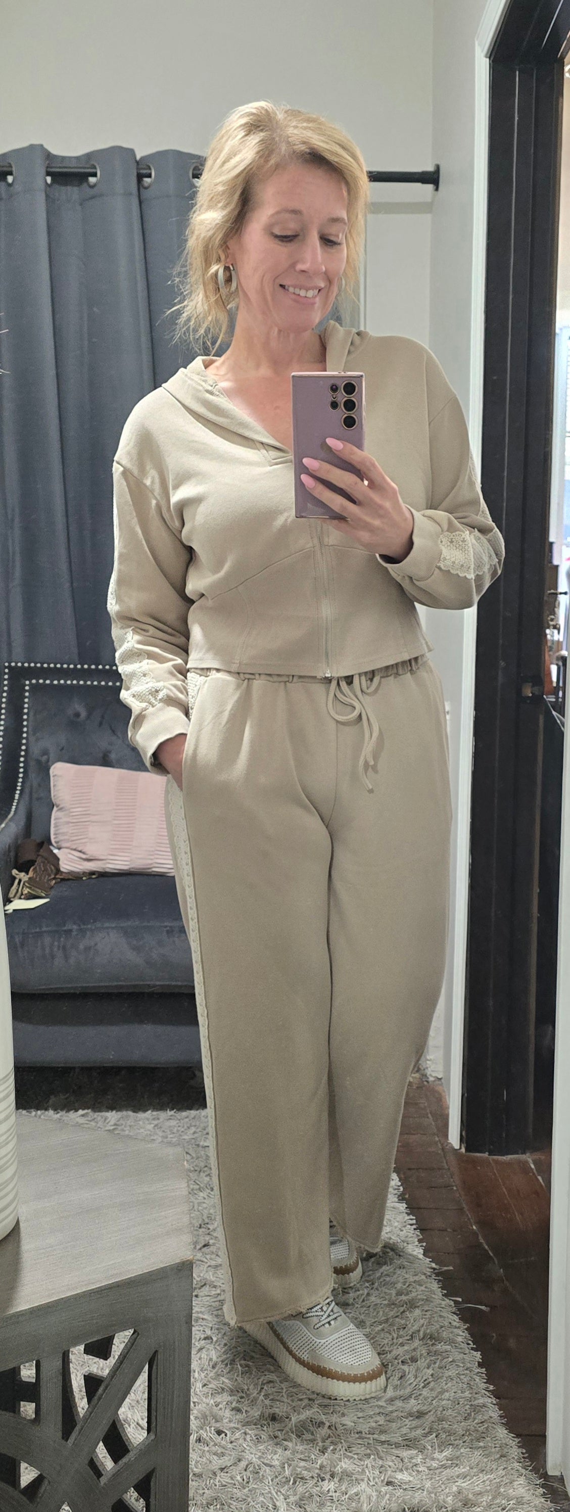 "Step up your loungewear game with the Chantilly 2pc Lounge Set. Complete with a comfy hoodie and stylish wide leg pants with lace detail, this taupe set is perfect for any laid-back occasion. And with pockets included, you'll never want to take it off!"