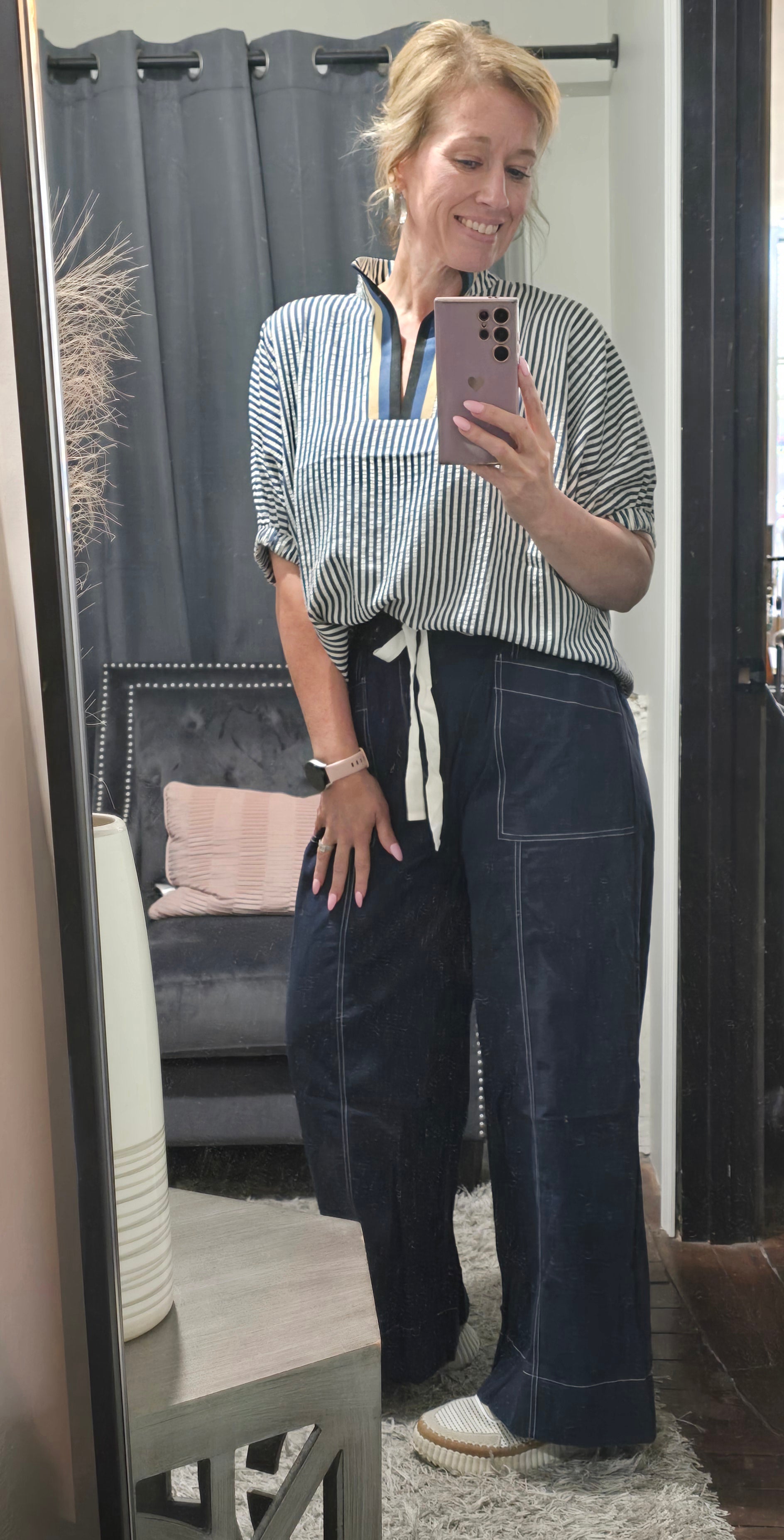 Effortlessly cool and endlessly comfortable, our Coastal Stroll Wide-Leg Pants feature a relaxed fit with bold contrast stitching for a modern, tailored edge. The soft elastic waistband with an adjustable tie offers all-day comfort, while oversized front pockets bring both style and functionality. Perfect for pairing with a breezy tee or a fitted tank, these pants are your go-to for laid-back days with a touch of chic.