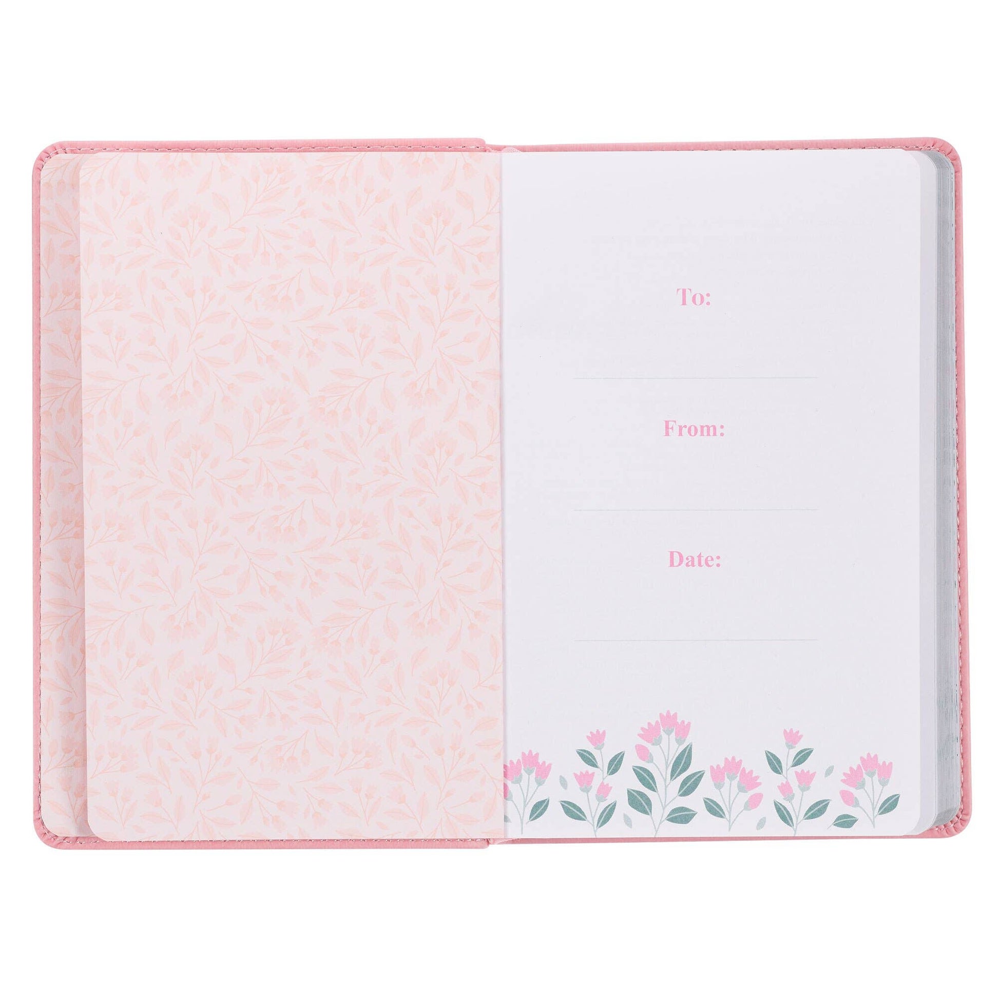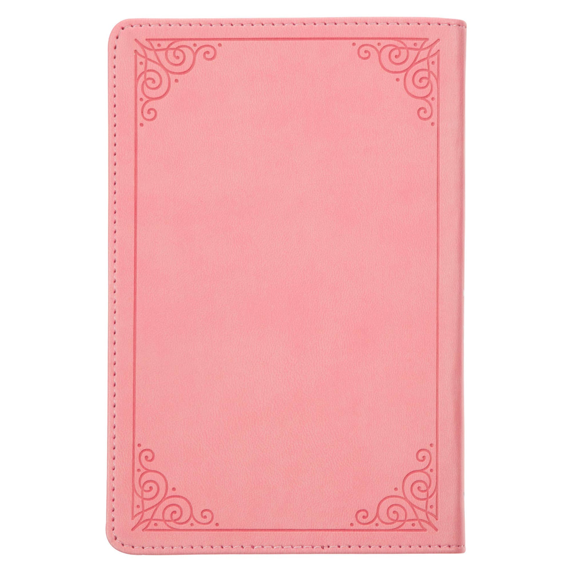 Heat-debossed frame with corner scroll designs, Pink faux leather, Silver-foiled title, Flexcover, Two-color interior, Satin ribbon marker, 348 gilt-edged pages, 100 devotions, Size: 7.2" x 4.8" x .8" (183 x 122 x 20mm)