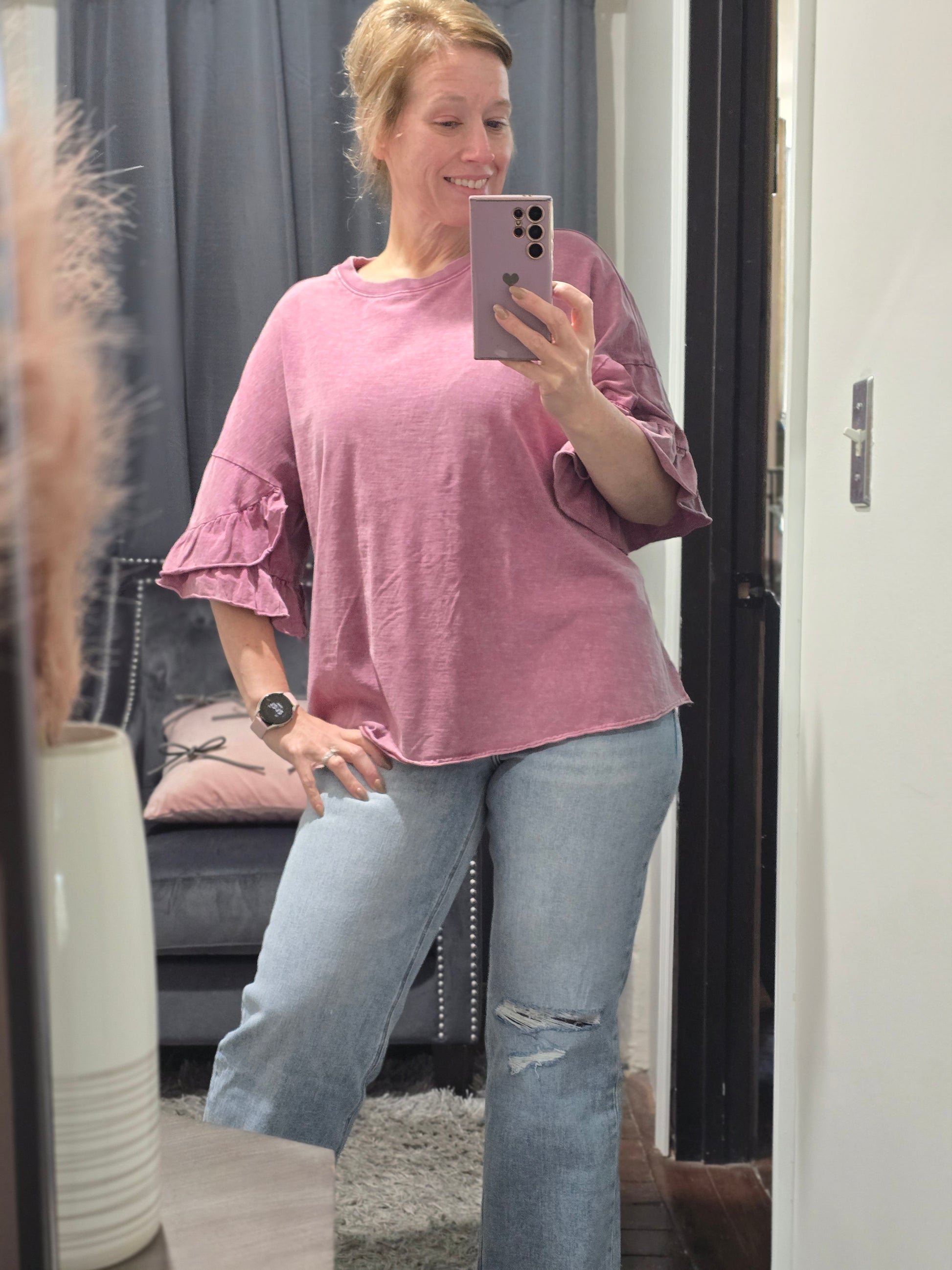 Add a touch of feminine charm to your everyday look with the Sweet Mauve Ruffle Sleeve Top. Featuring soft washed fabric and playful tiered ruffle sleeves, this relaxed-fit top is both comfy and stylish. The pretty mauve color brings a cozy yet cheerful vibe — perfect for pairing with jeans, booties, or sneakers for an effortlessly cute outfit.