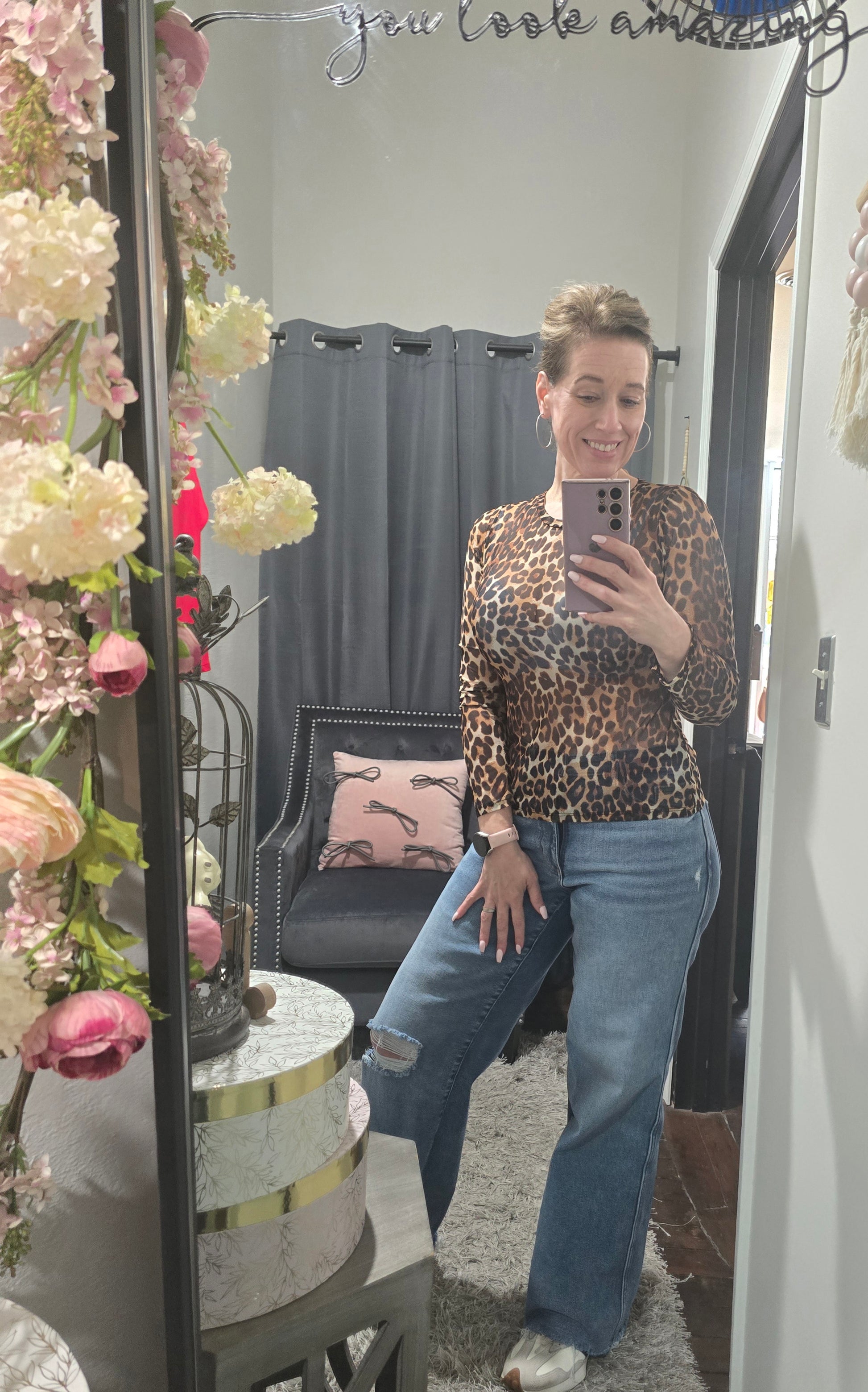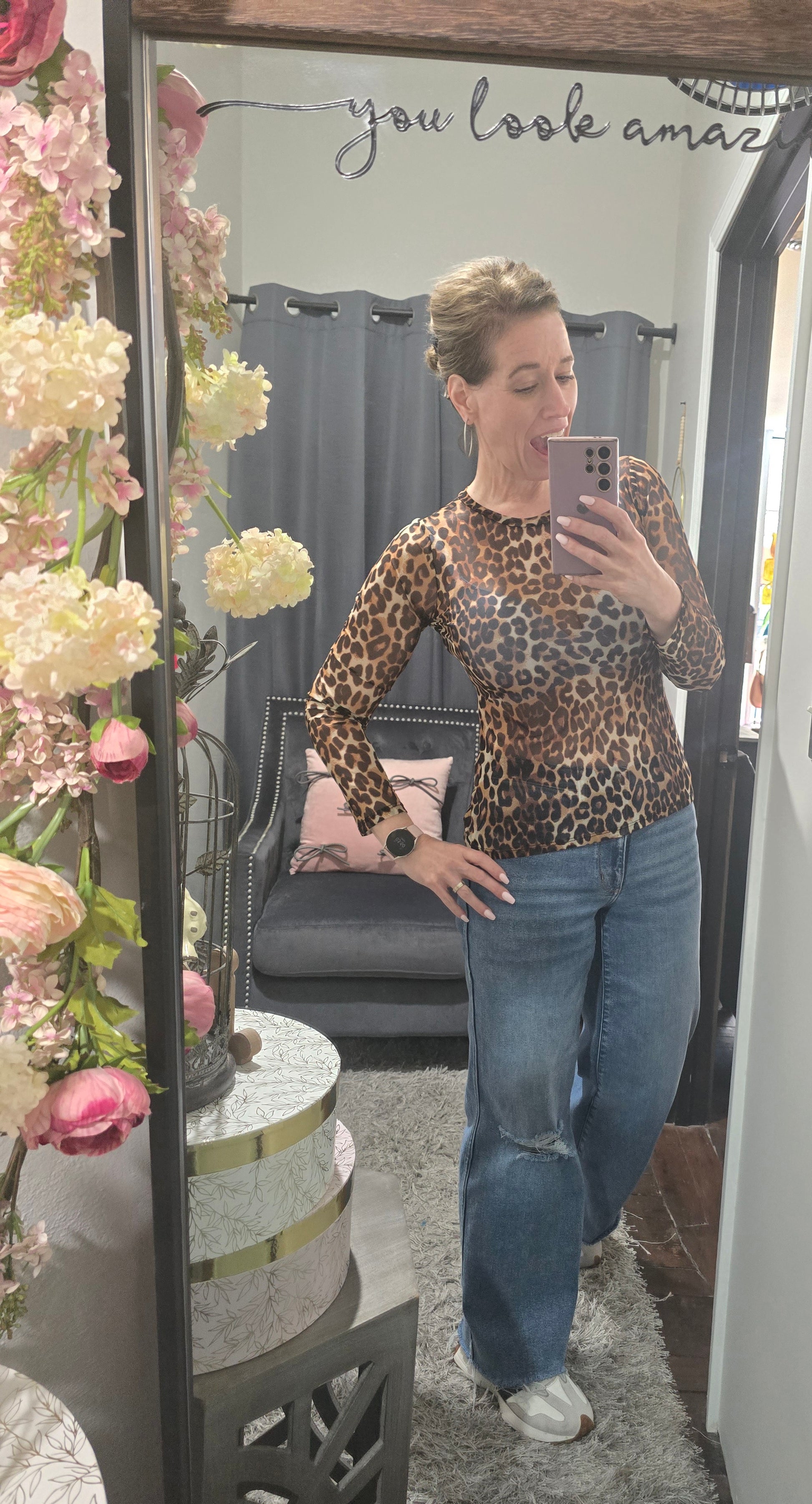 Turn heads and own your bold side in this stunning leopard mesh top. Designed with a lightweight, sheer fabric and a flattering fitted silhouette, this piece is perfect for layering or making a statement all on its own. The classic crew neckline and long sleeves keep it effortlessly chic, while the fierce print brings just the right amount of edge.