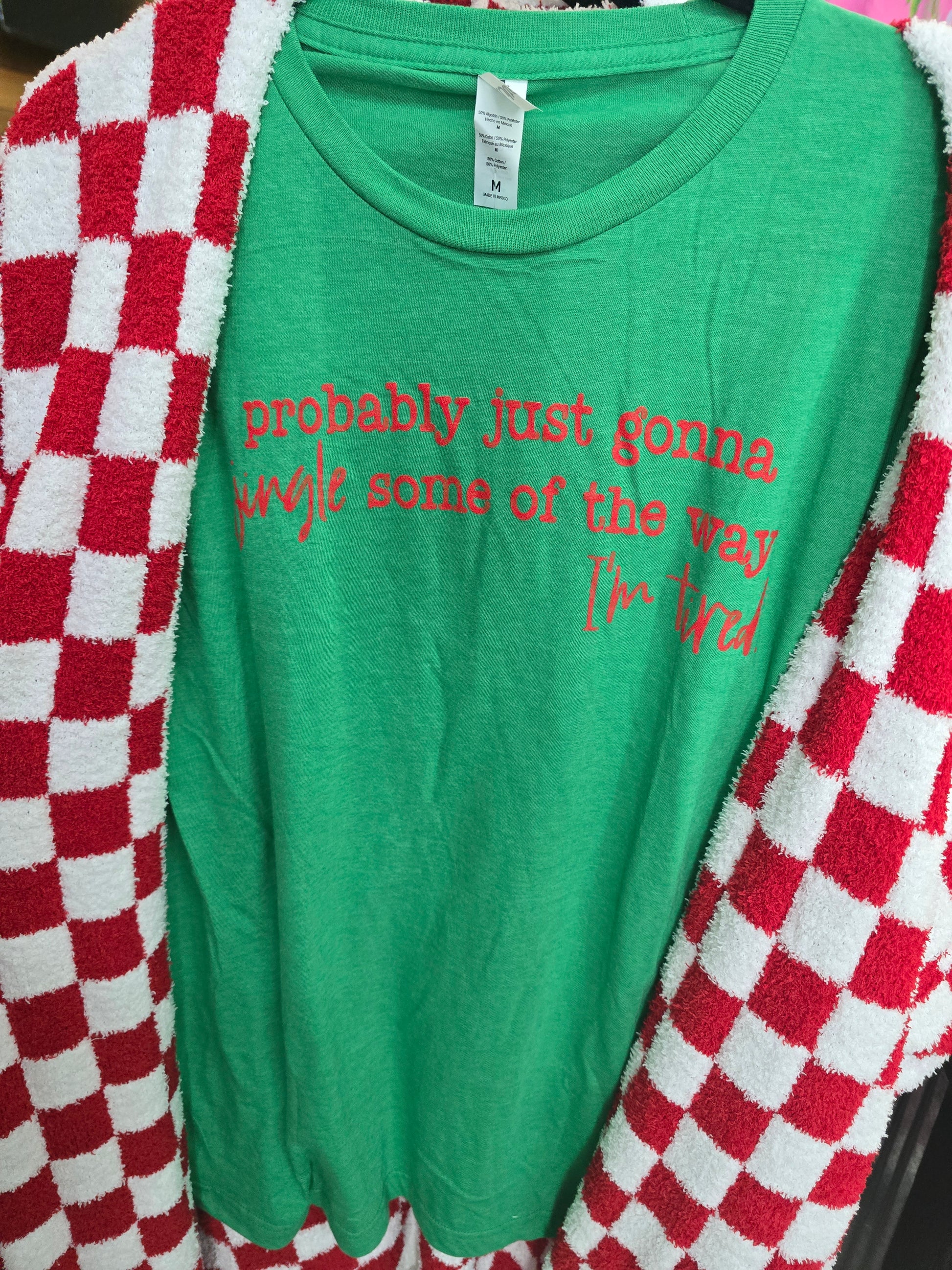 I'm probably just gonna jingle some of the way, I'm tired Christmas graphic tee, green and red.
