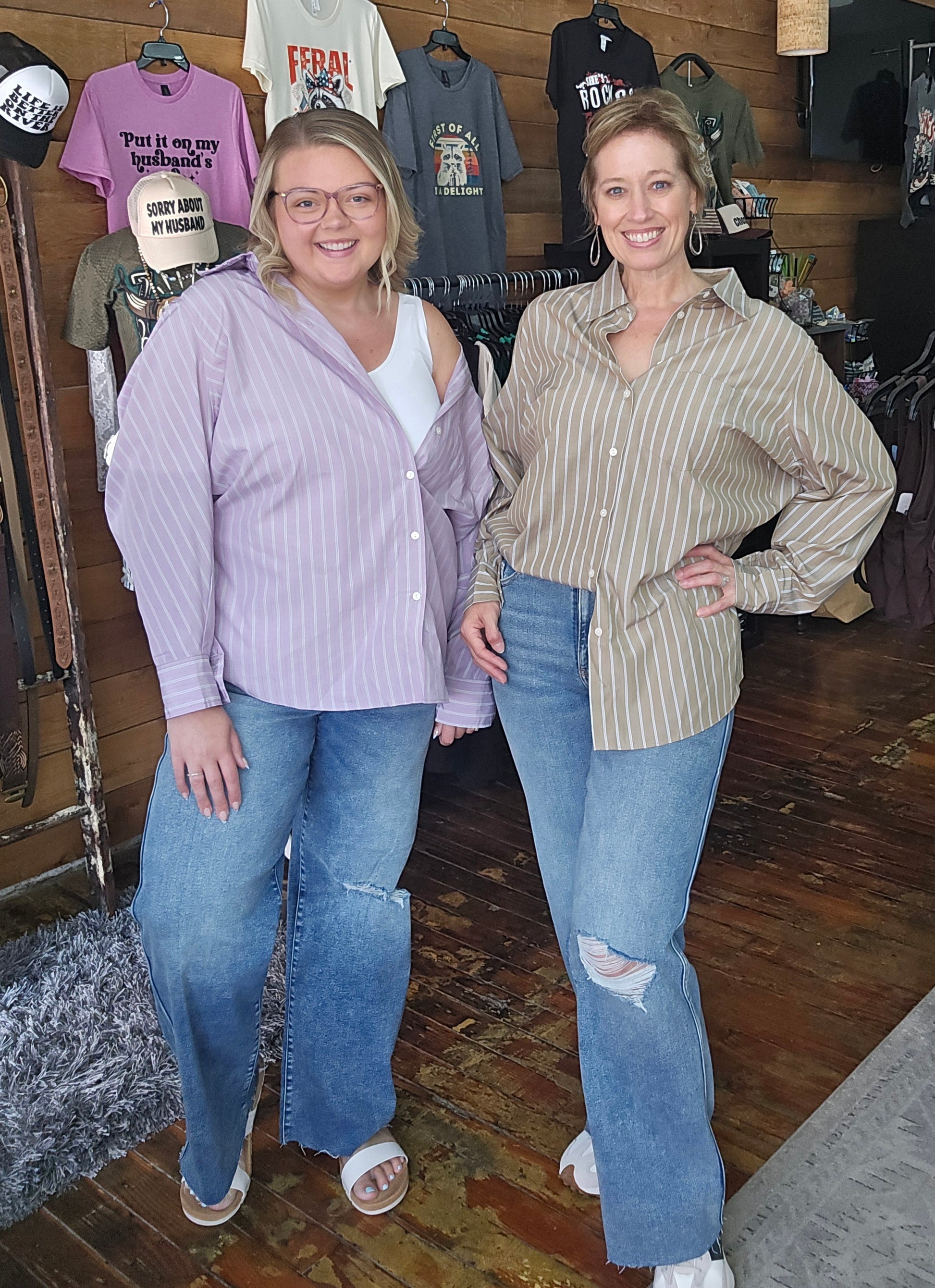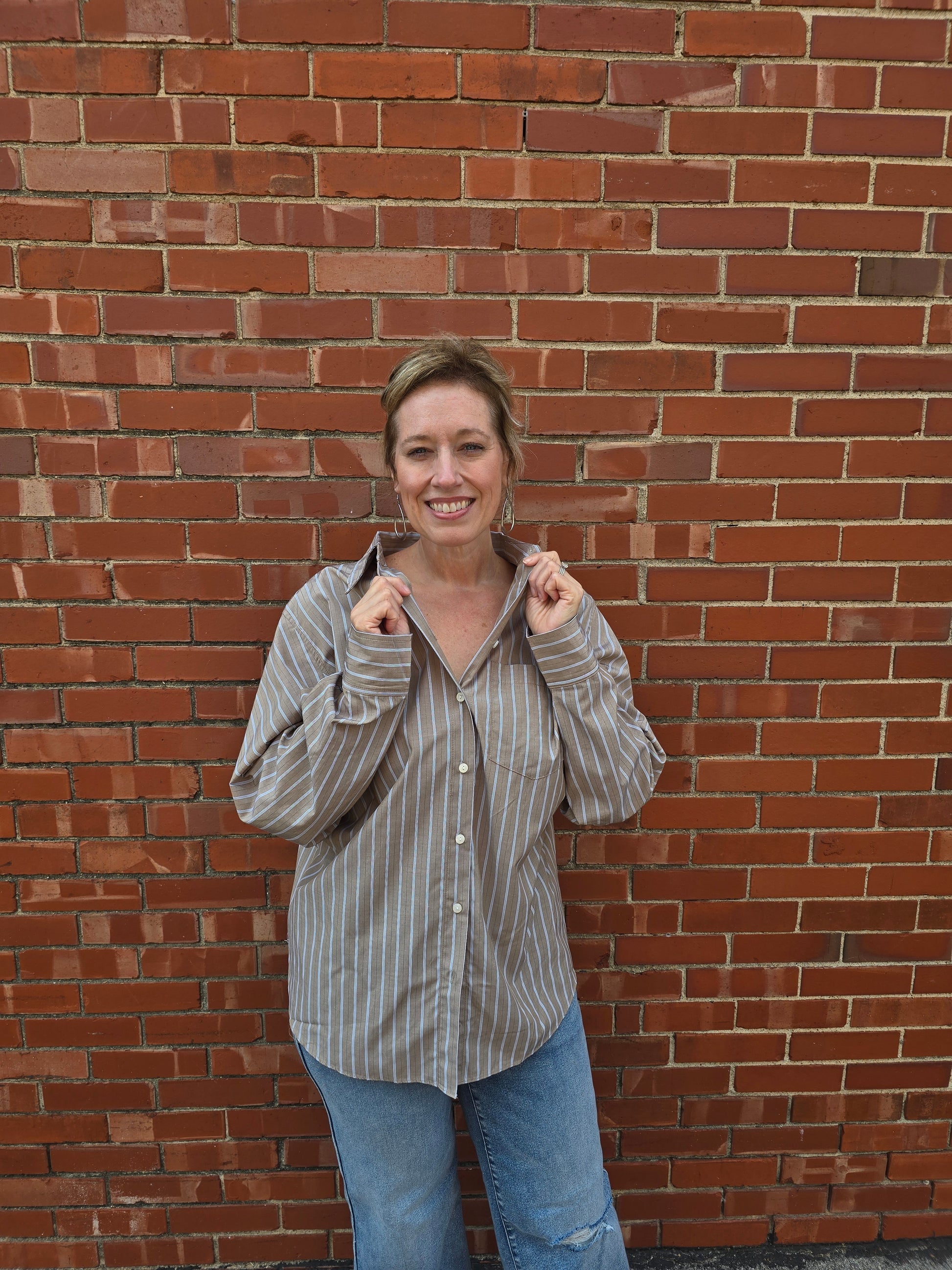 Get ready to strut your stuff in this KJ Pinstripe Button Up Blouse! Made from lightweight material, this top is super cute and comes in two unique colors - dusty lavender and dark mushroom. Perfect for a casual day out or dress it up for a night on the town. Top has a relaxed fit.
