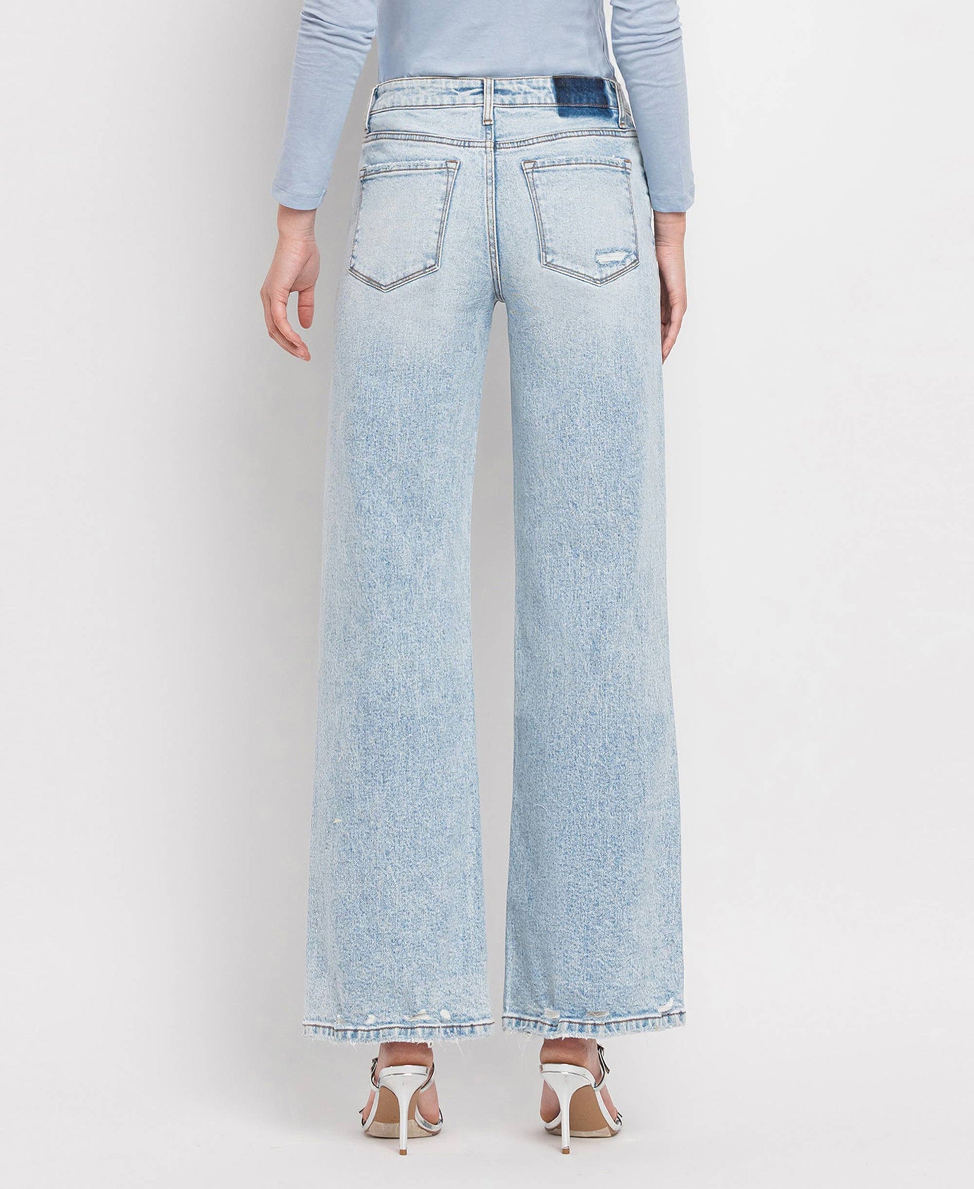 COMFORT STRETCH DENIM, SUPER HIGH RISE WAIST, DISTRESSED DETAIL, FULL LENGTH, WIDE LEG JEANS
